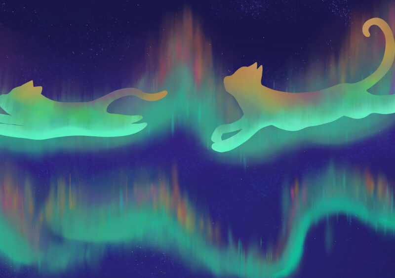 Thrill in the chase of two Aurora cats flying through the skies at night in greens, blues, reds and oranges.