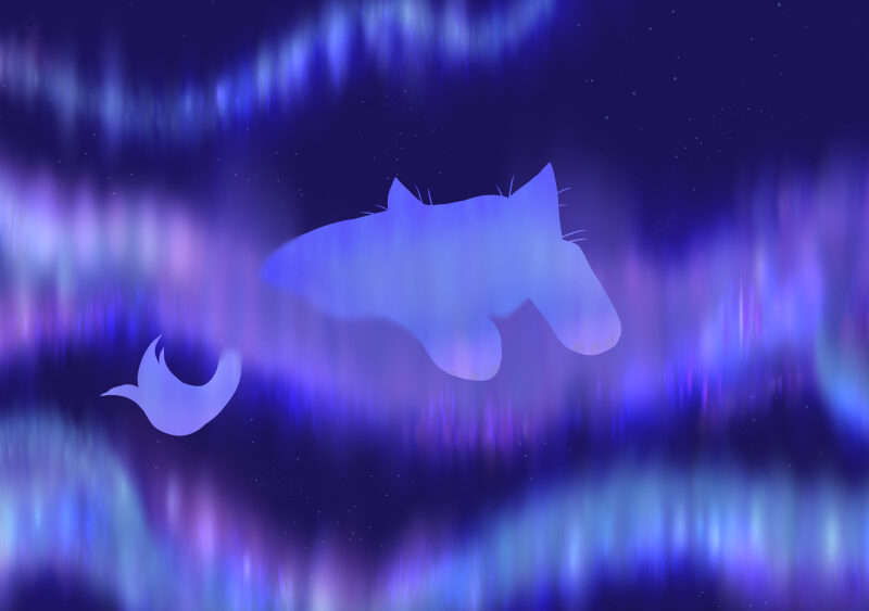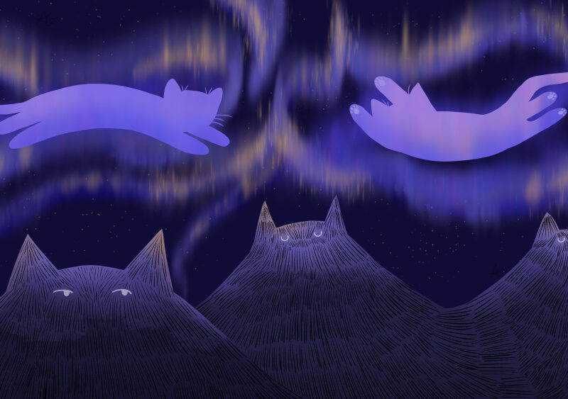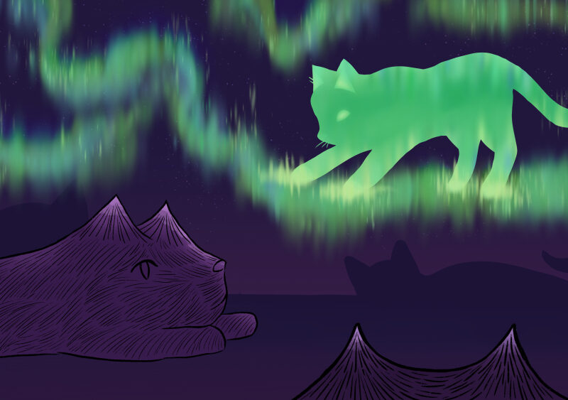 Mountain cats sleeping and one watching the Aurora cats flying around them in the skies in the solar storm.