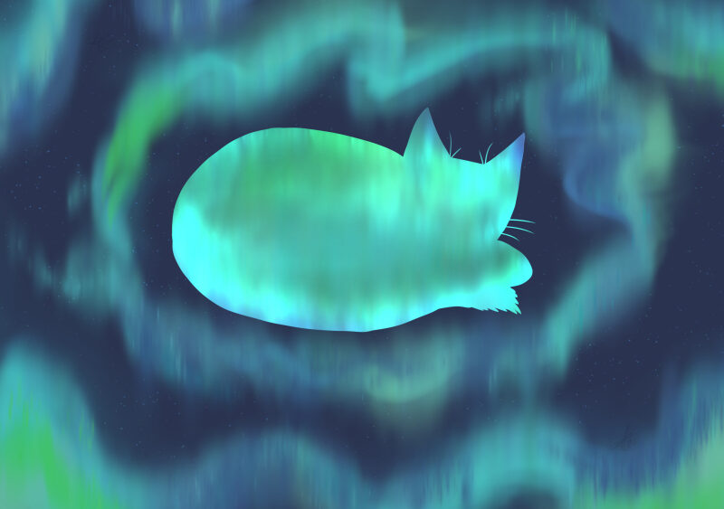 Sleeping Aurora cat in the centre of a solar storm
