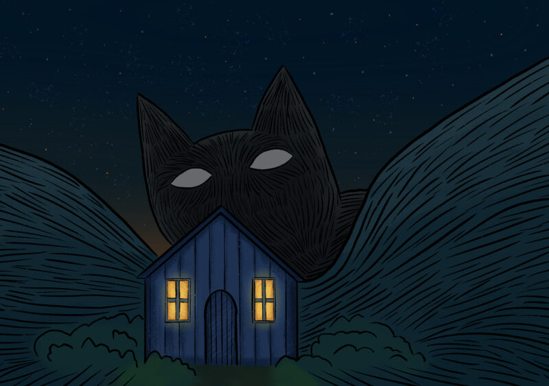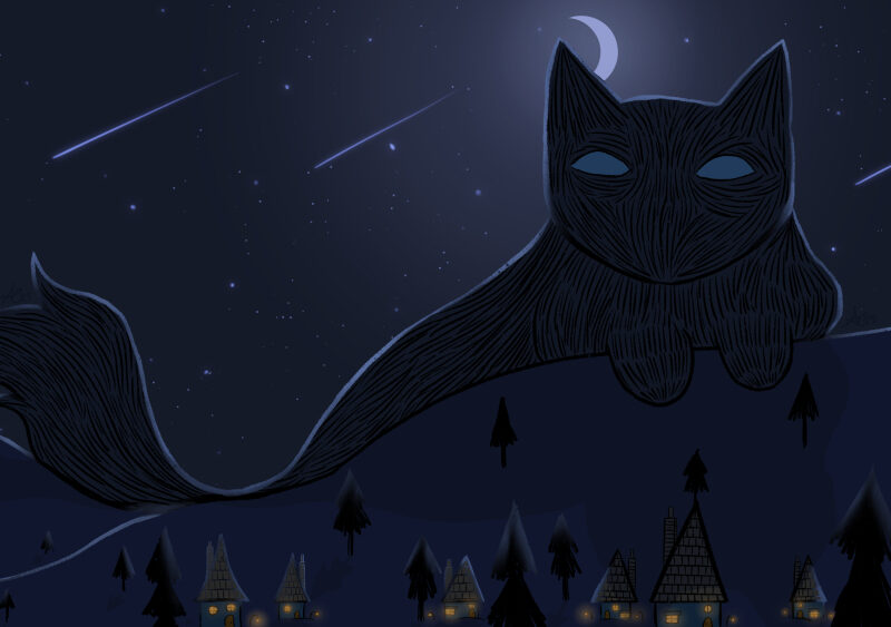 Yule cat peering over a house in a valley in the dead of night